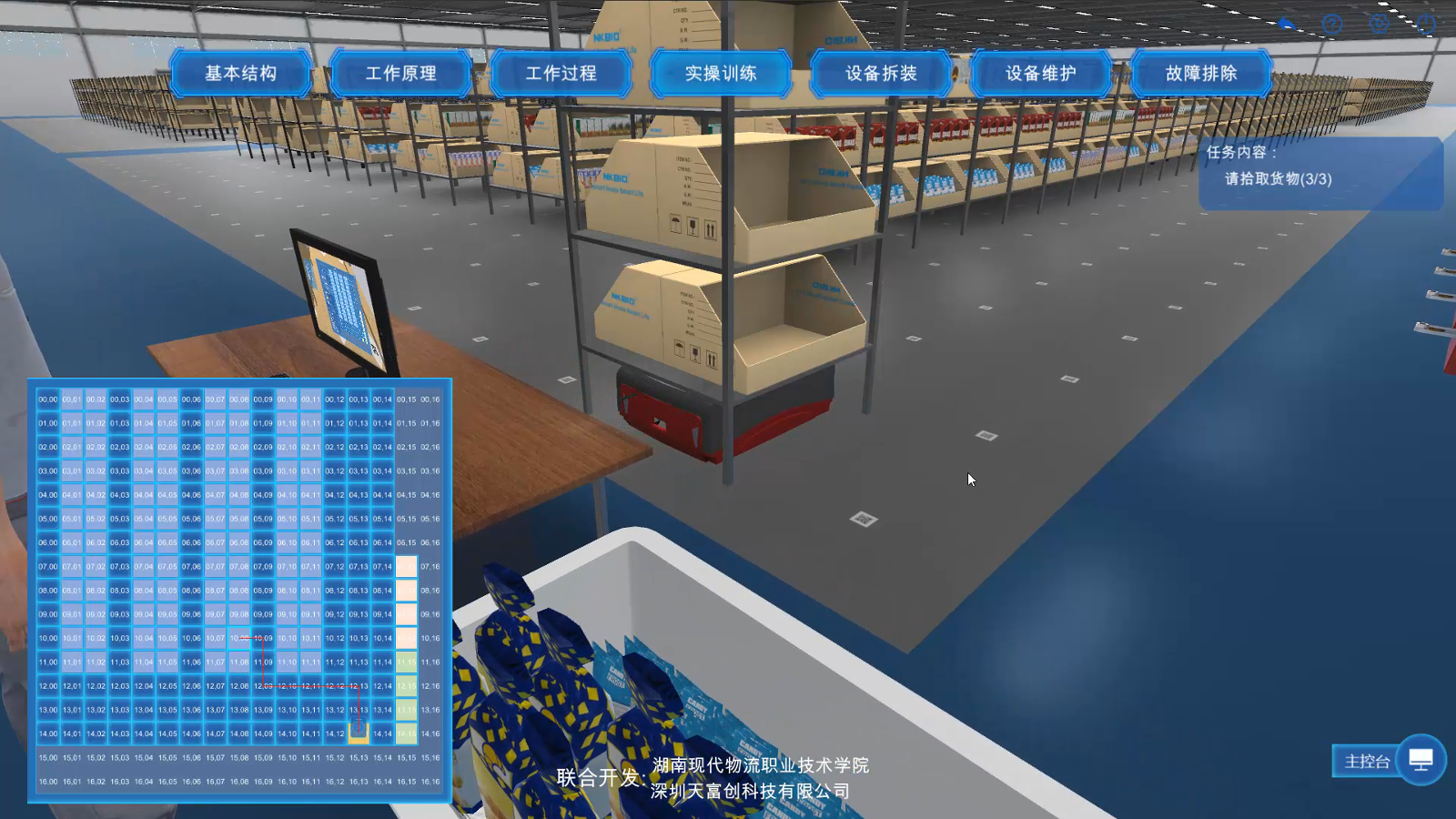 利用三维虚拟技术实现了现代物流行业中目前较为先进的拣选机器人的工作原理、基本结构、设备拆装、操作流程、工作过程、故障排除等训练内容。从而达到对学生教学和训练目的。