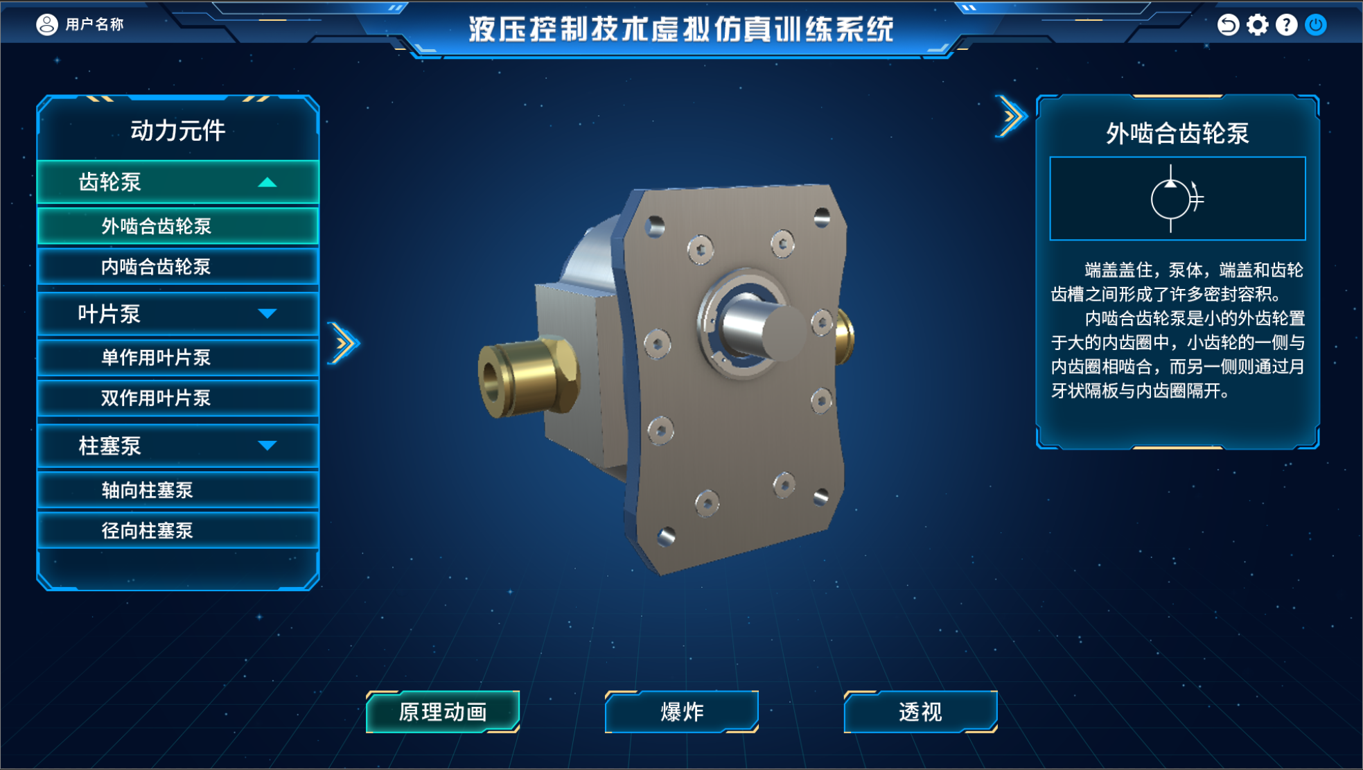 液压与气动控制虚拟仿真实训系统是一款面向机械与装备制造类专业的专业基础课教学的课堂应用软件。软件以教学大纲中的知识点为核心,将液压元件中不易理解的复杂结构和原理通过爆炸、剖切、透视、隐藏等方式呈现,便于学生清晰直观的了解元件结构及功能,通过回路搭建实训模块,让学生更加深刻的掌握各元件符号的意义并理解元件的作用。