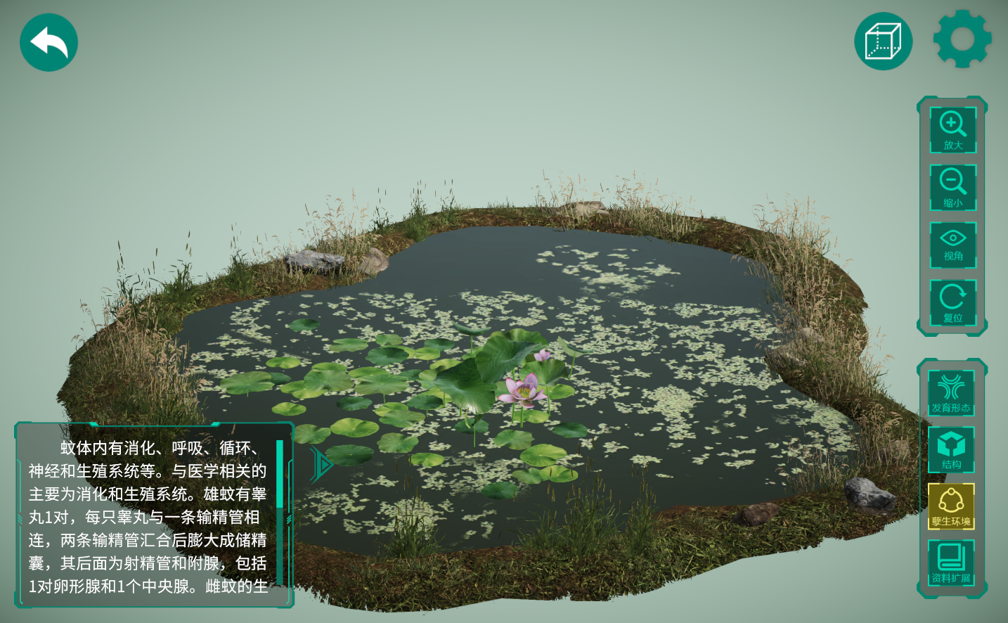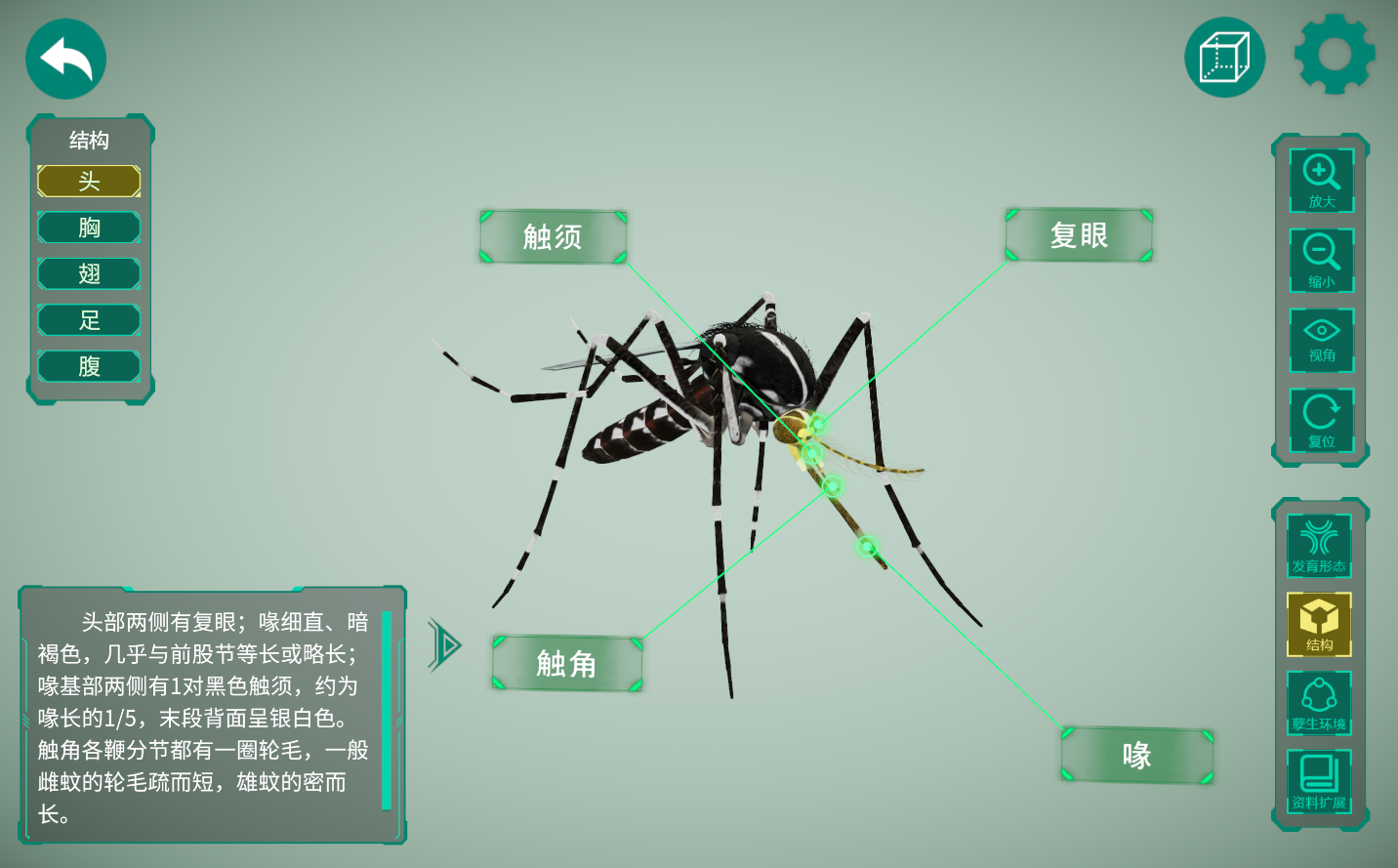 一款基于裸眼3D立体仿真技术开发的,面向病媒科研人员培训及中小学生的病媒知识科普学习软件。软件包含病媒生物模型査看模块、虫媒监查训练模块、多人知识竞赛,多人在线小游戏,让用户通过模型熟悉病媒不同发育形态、生物特征结构、孳生环境,在学习与知识竞赛游戏中了解病媒生物的习性与危害,掌握病媒生物防治的方式方法。